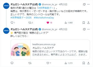 オムロン ヘルスケアの「X」にて、世界喘息デーのツイートが発信されています。当フォーラムが把握している限り、今年(2026年)の世界喘息デーの最初の参画企業ではないかな、と思います。ぜひとも「X」にてオムロン ヘルスケアのフォローをお願いいたします。