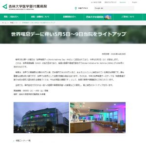 杏林大学医学部付属病院 今年もライトアップ 2026年4月29日 最終更新日時 : 2026年4月29日 nsaito 杏林大学医学部付属病院でも、「世界喘息デー」のために 5月5日(火)~9日(土)夜間にライトアップ(青と緑色)が予定されています。案内は以下です。 世界喘息デーに伴い5月5日~9日当院をライトアップ | 特集コーナー | 杏林大学医学部付属病院 KYORIN UNIVERSITY HOSPITAL 毎年5月の第一火曜日は「世界喘息デー(World Asthma Day: WAD)」に認定されており、今年は5月5日(火)が該当します。 これは、世界保健機構(WHO)の協力団体であり、… 杏林大学医学部付属病院 KYORIN UNIVERSITY HOSPITAL FacebookXBluesky